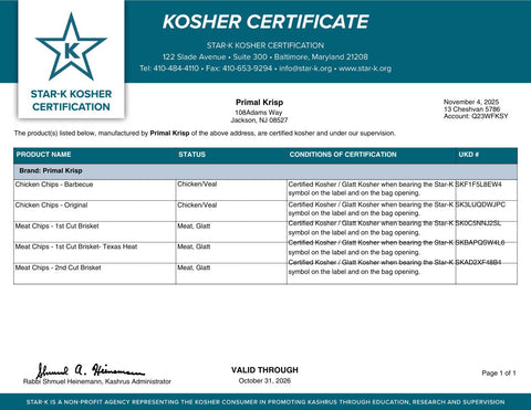 At Primal Krisp, we believe in clean ingredients and high-quality standards. That’s why our chicken and beef meat chips are proudly Glatt Kosher certified.